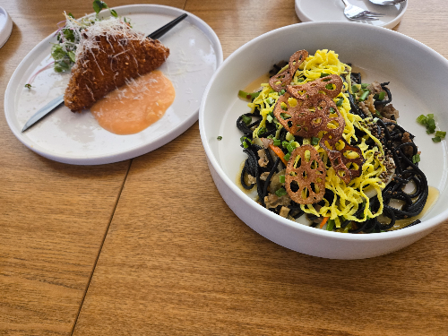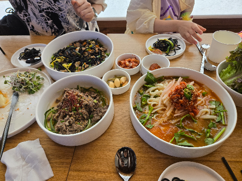 - '수경사'의 시그니처 메뉴는 2인 잡채파스타 한상세트로 경주 소불고기와 연잎밥, 연근칩 잡채파스타, 대릉원 치즈튀김으로 구성되어 있었습니다. 우리 가족은 성인2명과 미취학 아동 2명이라 2인 잡채파스타 한상세트와 여름시즌 메뉴 청도미나리 육회물회로 아이와 어른의 입맛을 모두 만족할 만한 메뉴로 주문을 했고, 그 선택은 옳았습니다.